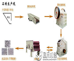 首先,石料由給料機(jī)均勻地送進(jìn)粗碎機(jī)進(jìn)行初步破碎,然后,產(chǎn)成的粗料由膠帶傳送機(jī)輸送至反擊式破碎機(jī)進(jìn)行進(jìn)一步破碎,細(xì)碎后的石料進(jìn)振動(dòng)篩篩分出不同規(guī)格的石子,不滿足粒度要求的石子反料進(jìn)反擊式破碎機(jī)再次破碎。