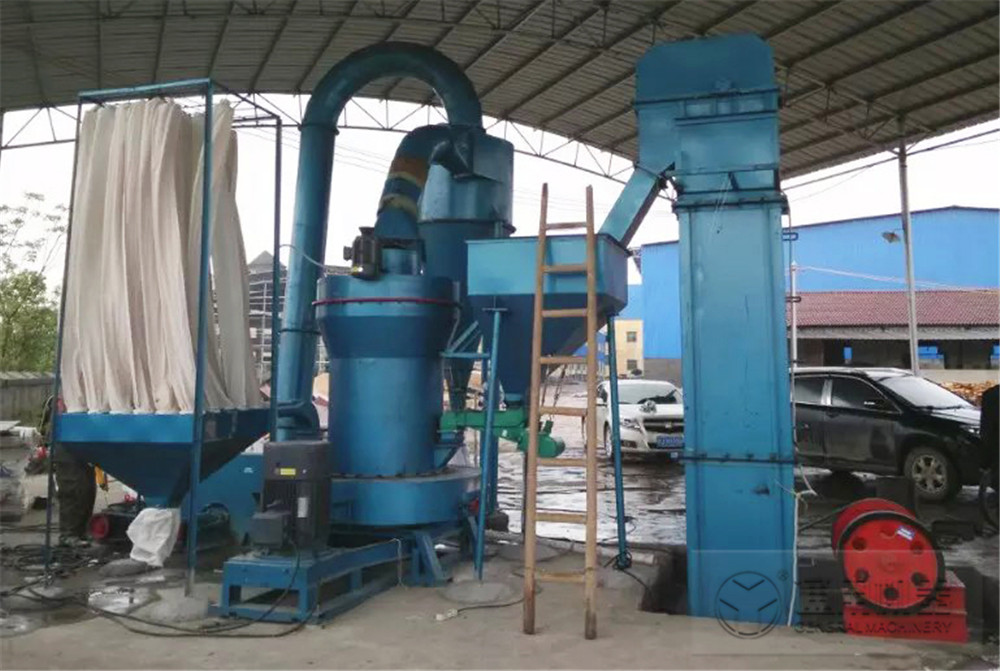 物料由鏟車進料到原料倉,原料倉的料再由下端的自動給料機,輸送至YGM85主機進行粉磨,成品由集粉器送至打包機打包。