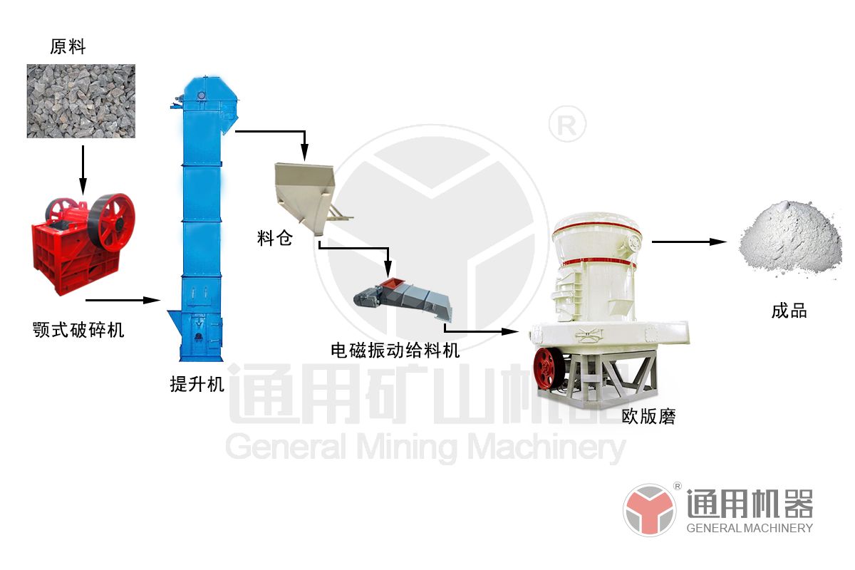 大塊物料經破碎機破碎到所需粒度(30mm)后,由提升機將物料送至儲料斗,再由皮帶機將物料均勻定量連續地送入主機磨室MTW175磨粉機內進行研磨。粉磨后的物料被風機氣流送入選粉機進行分級。在選粉機葉輪的作用下,不符合細度要求的物料落入磨室內重新碾磨;合格的物料則經空氣斜槽進入旋風集粉器內,進行分離收集,經排料裝置排出即為成品粉體。整個過程屬于閉路循環系統,并在正負壓狀態下運行,配備以脈沖除塵器,保證了生產現場的干凈、整潔。